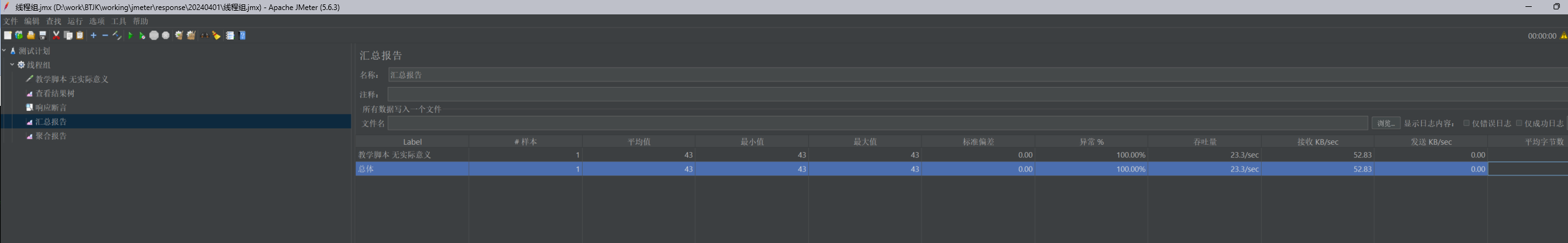 添加汇总报告 在此处可以看出运行脚本的平均值、最小值、最大值、吞吐量等等